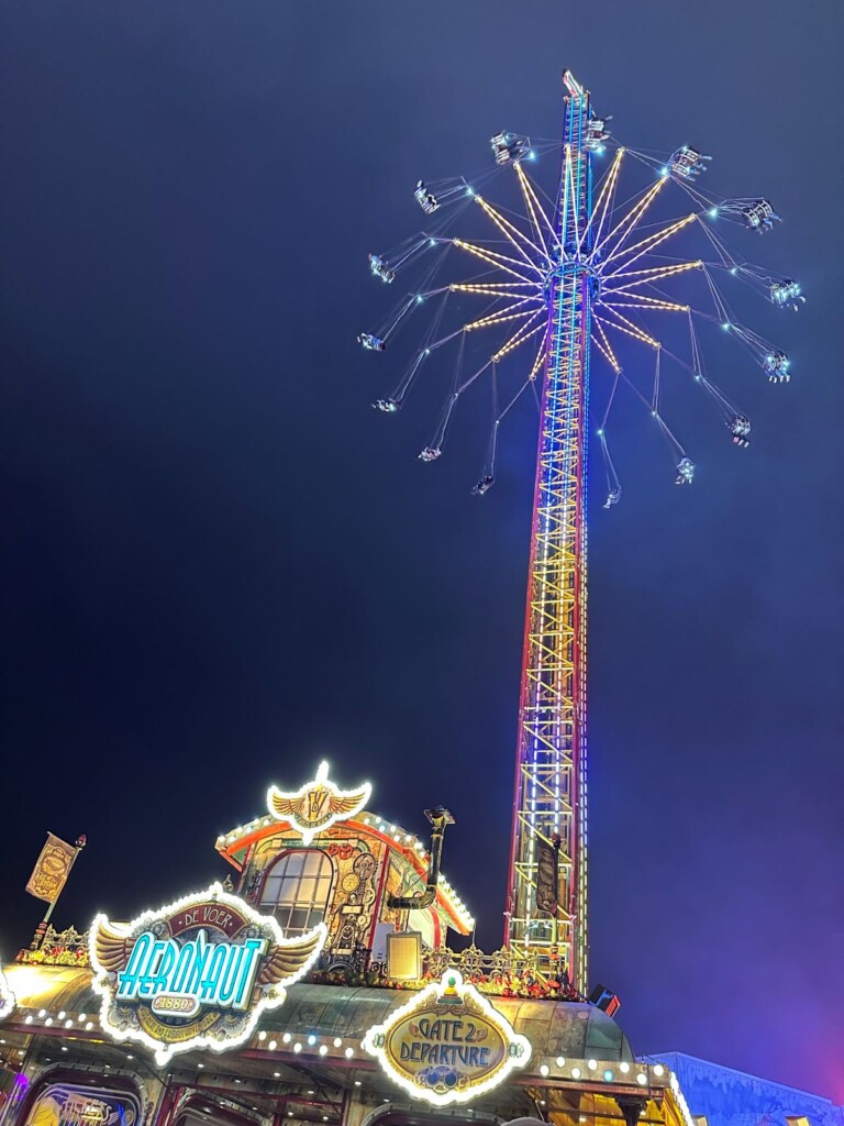 長い鎖に繋がった椅子がくるくるくるくる回りながら、かなり高いところまであがっていく乗り物で、物をもって乗ると飛ばされるからと、手荷物はほとんど持たず下に置いていきました。