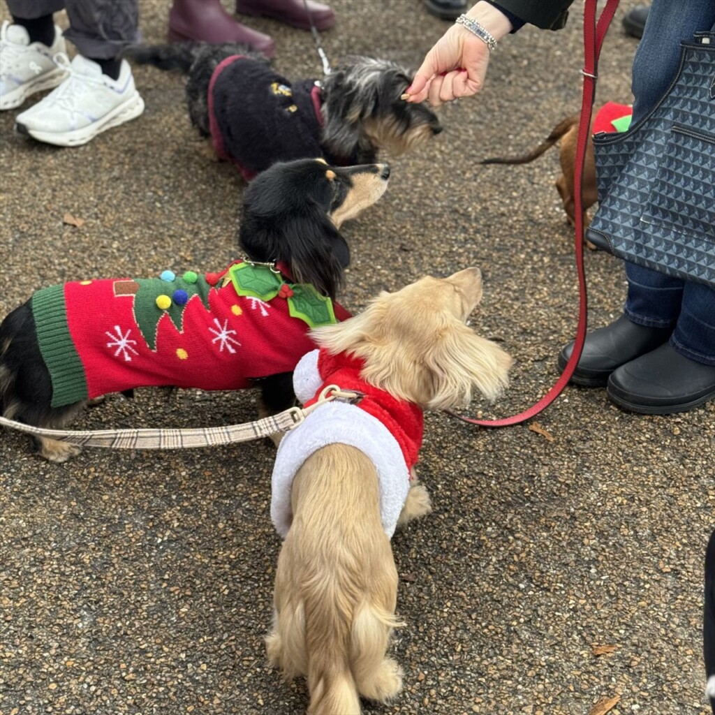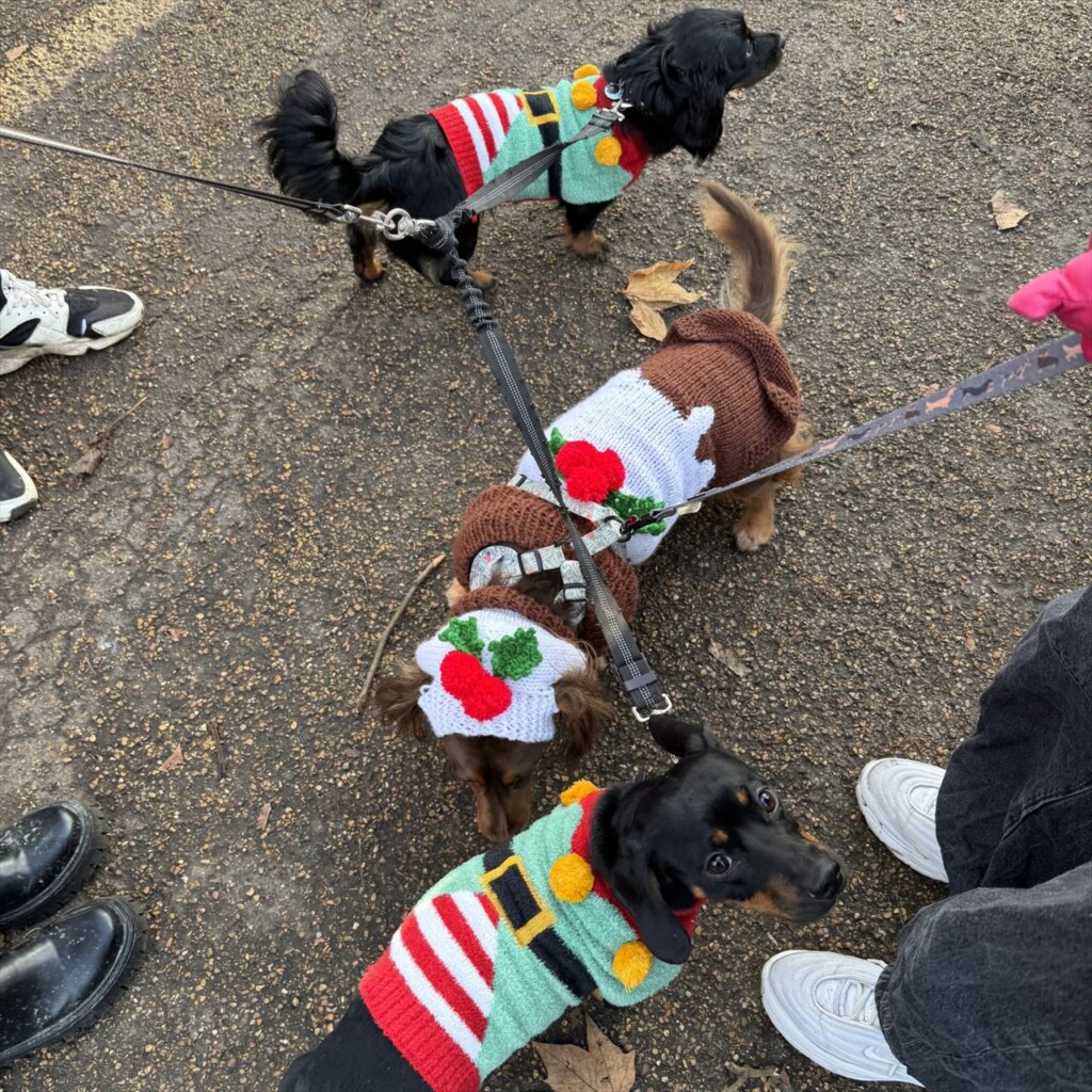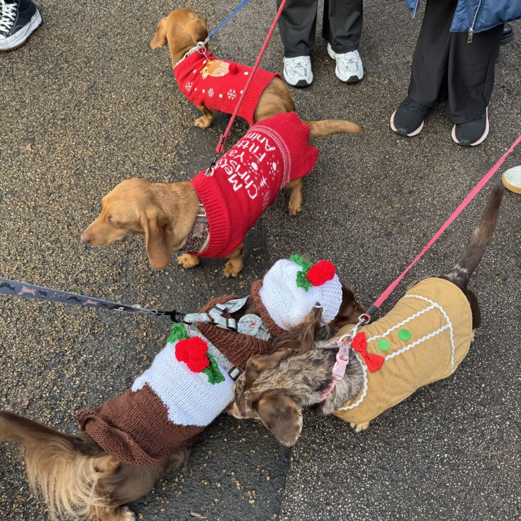 ソーセージウォークのクリスマスの集いの楽しみはクリスマスジャンパーを着て参加する事。飼い主とソーセージドッグたちとリンクしたコーデで参加し、素晴らしい仮装の犬には商品が送られます。協賛のドッグフードや犬用のグッズ、洋服やペットサロンのチケット等が貰えるので、みんな張り切って衣装を考えて参加します。