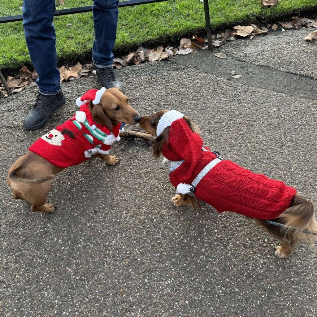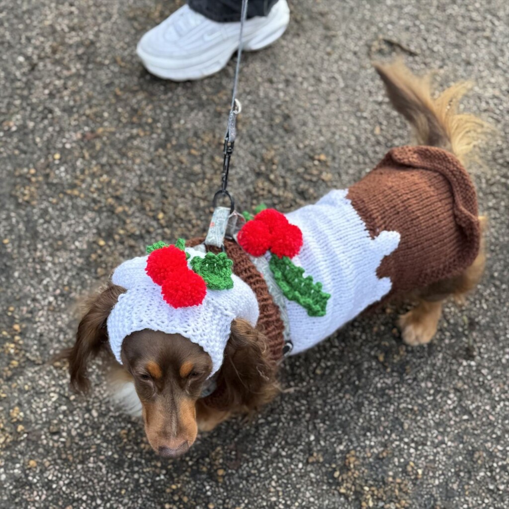 ちなみに愛犬ロンは茶色でちょっぴりチャビー(太目)なのと白い胸毛がクリスマスプディングに似ているので、クリスマスプディング柄のセーターと帽子を編んで着せて行きました。偶然、クリスマスプディングを着たソーセージドッグ柄のジャンパーを見つけたので娘がそれを着て私はスパンコールのダックスフンド柄のジャンパーを着て参加。