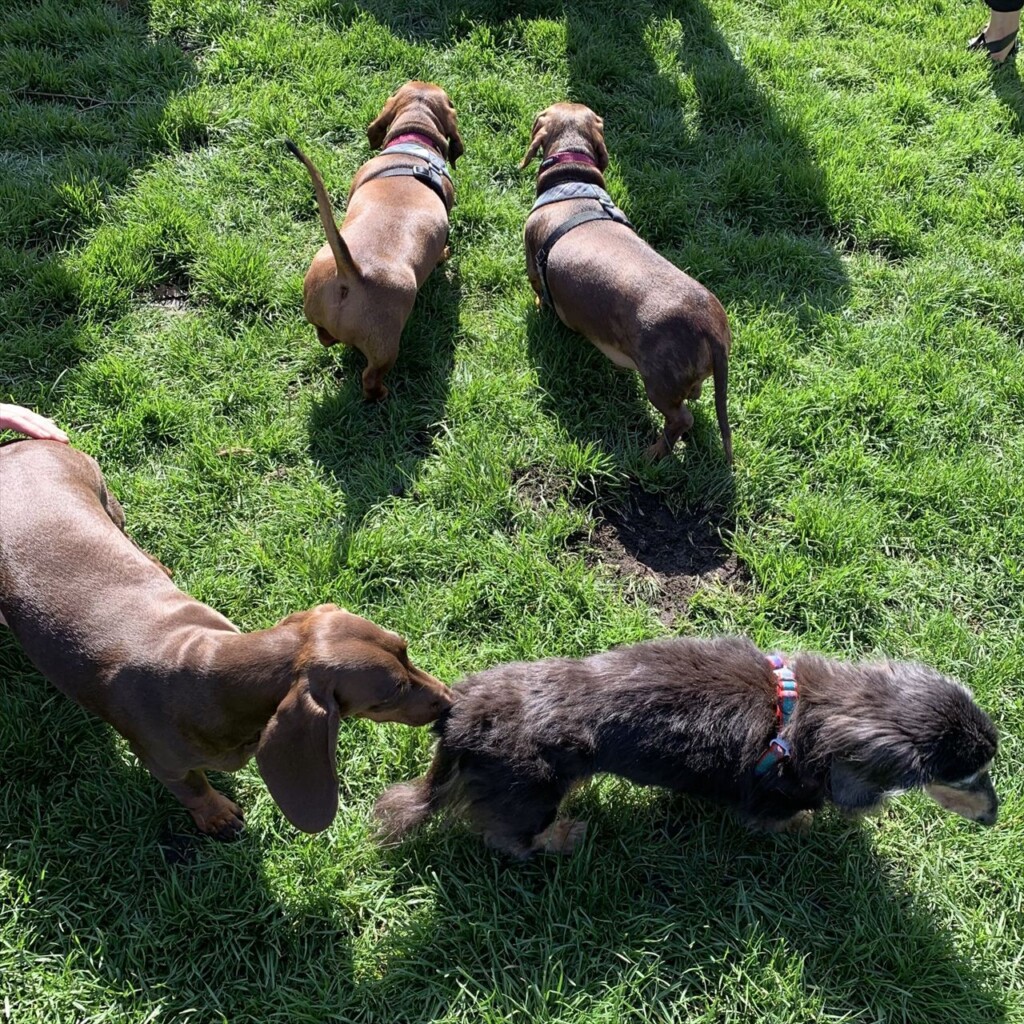 最初は少人数の集まりでしたが同じ犬種、特にダックスフンドは狩猟犬なので群れをなして走ったり遊んだりするのが大好きなので、公園を30分ほどお散歩して、最後は広場で遊んだり飼い主たちが交流する楽しい会合で犬を介してお友達も出来ました。