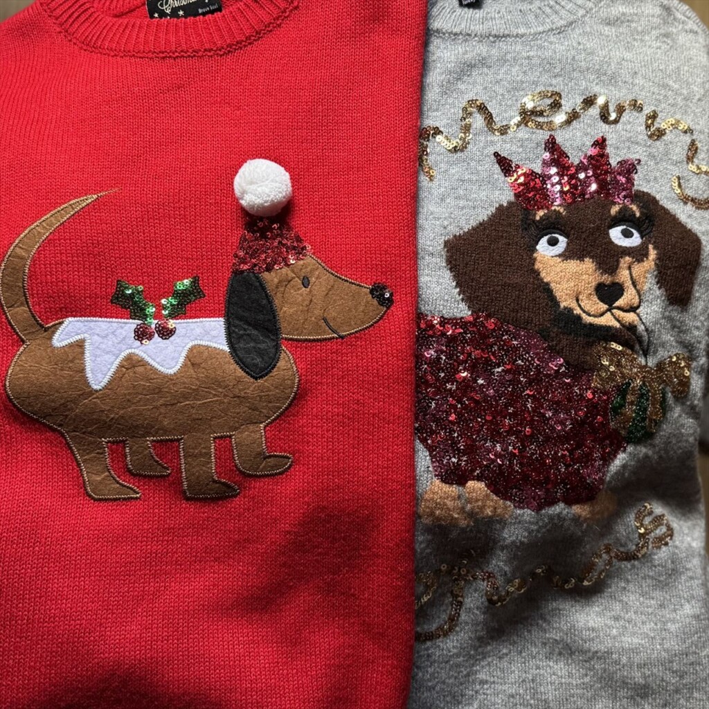 カラフルなクリスマスジャンパーを着て遊ぶソーセージドッグ