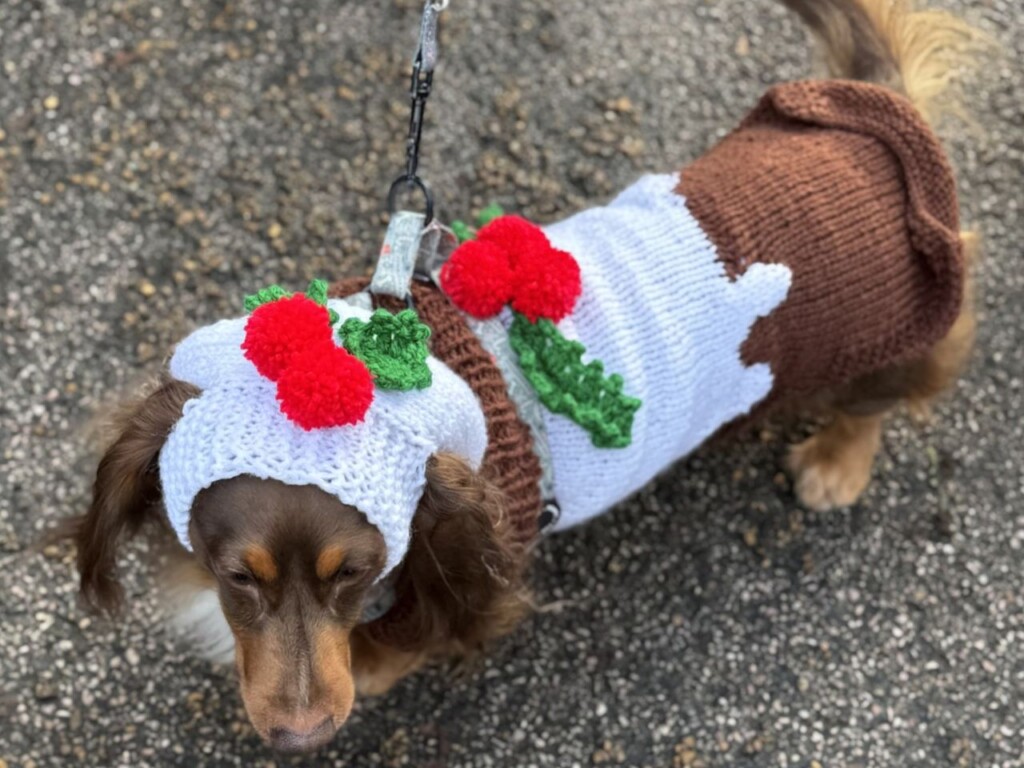 ちなみに愛犬ロンは茶色でちょっぴりチャビー(太目)なのと白い胸毛がクリスマスプディングに似ているので、クリスマスプディング柄のセーターと帽子を編んで着せて行きました。偶然、クリスマスプディングを着たソーセージドッグ柄のジャンパーを見つけたので娘がそれを着て私はスパンコールのダックスフンド柄のジャンパーを着て参加。