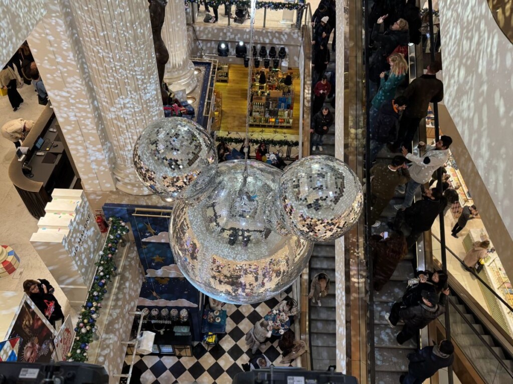 店内のエスカレーターのエリアに毎年キラキラのミラーボールが飾られますが、今年のミラーボールは巨大なミッキーマウス型。