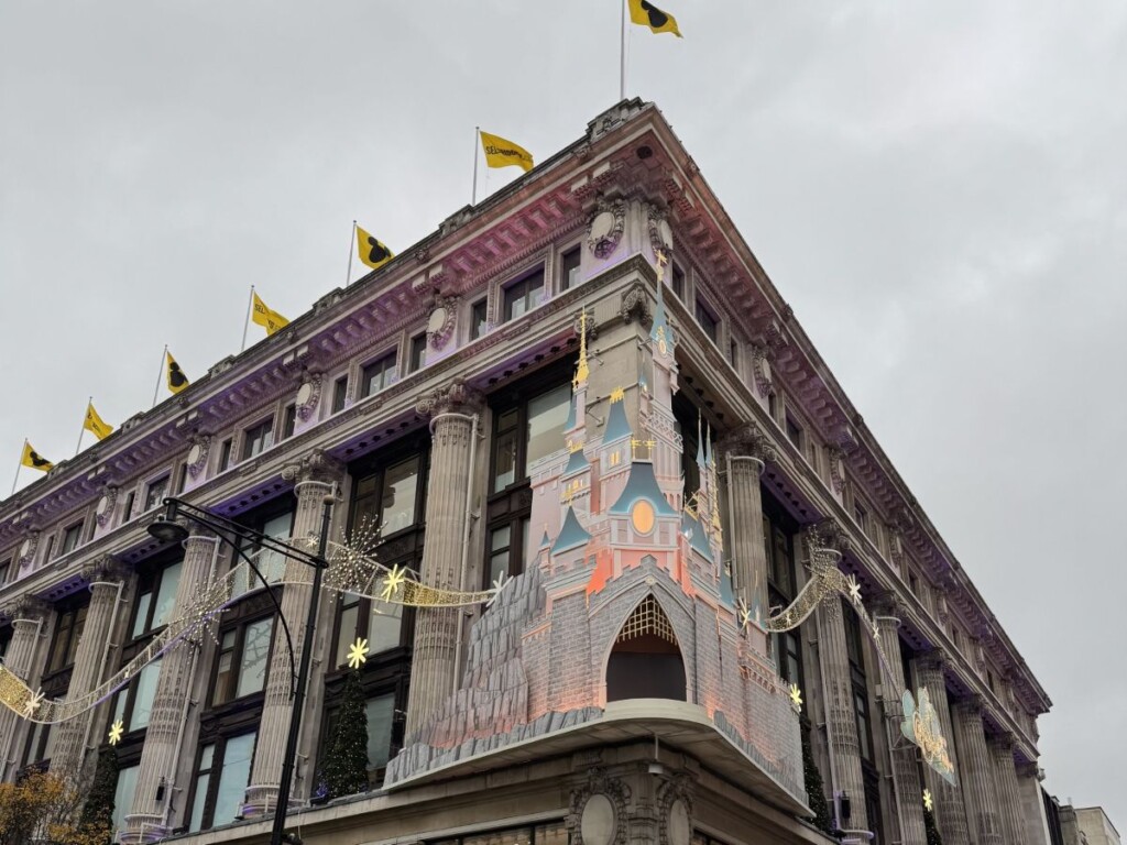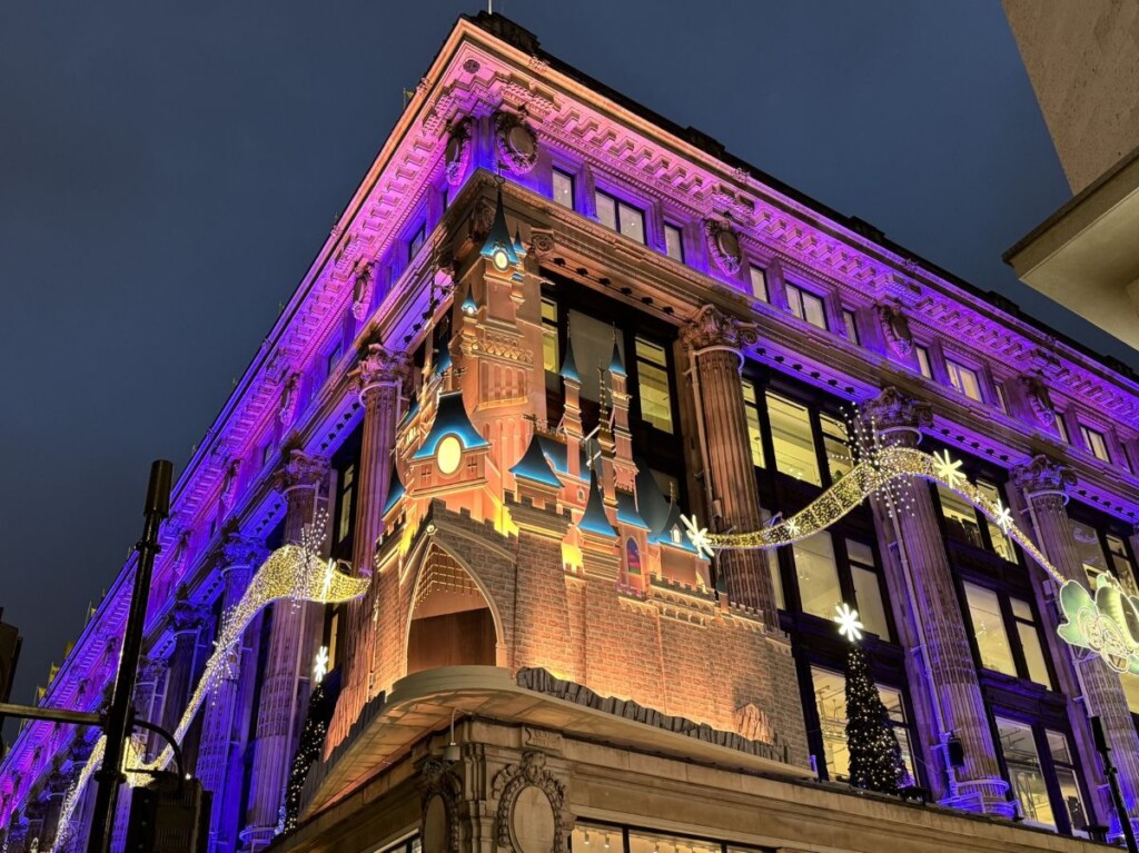 2025年ロンドンのクリスマスイルミネーションで必見は、セルフリッジズとディズニーがコラボした魔法の世界を織りなすマジカルクリスマス!セルフリッジズの外観にパリのディズニーランドの美女と野獣のお城をフィーチャーしたディズニーキャッスルのファサードが登場しました。