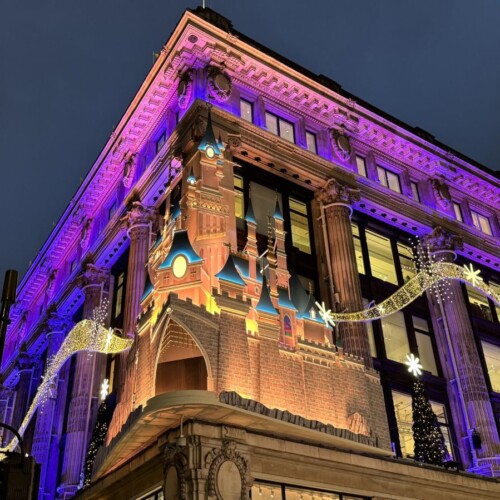 2025年ロンドンのクリスマスイルミネーションで必見は、セルフリッジズとディズニーがコラボした魔法の世界を織りなすマジカルクリスマス!セルフリッジズの外観にパリのディズニーランドの美女と野獣のお城をフィーチャーしたディズニーキャッスルのファサードが登場しました。
