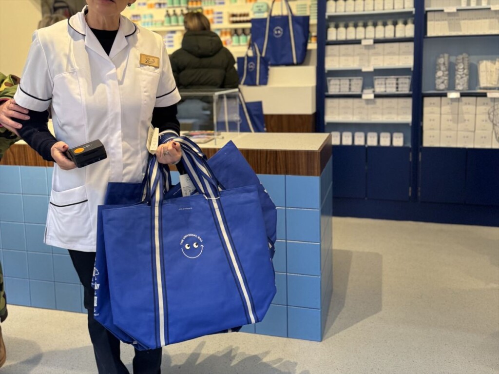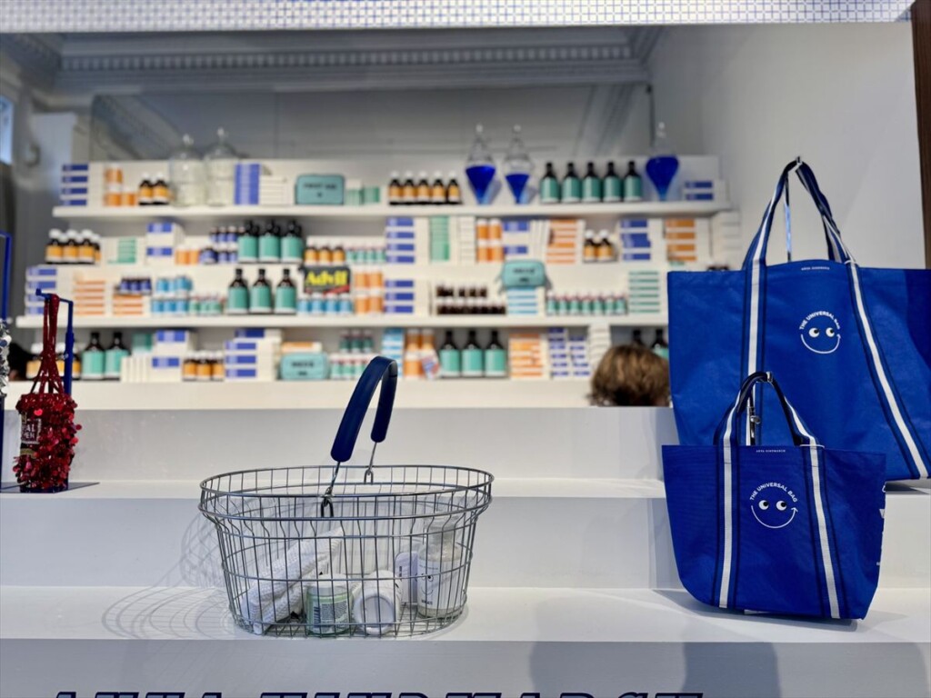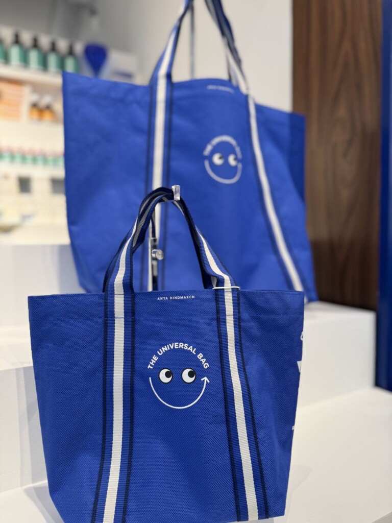 更にブーツのブランドカラー、ブルーパレットに白のストライプのアクセントが入ったユニバーサルバッグも販売されました。大人気のユニバーサルバッグはアニヤのポップアップでは大小セットでの販売。3月にはブーツにて大バッグのみ販売が予定されています。
