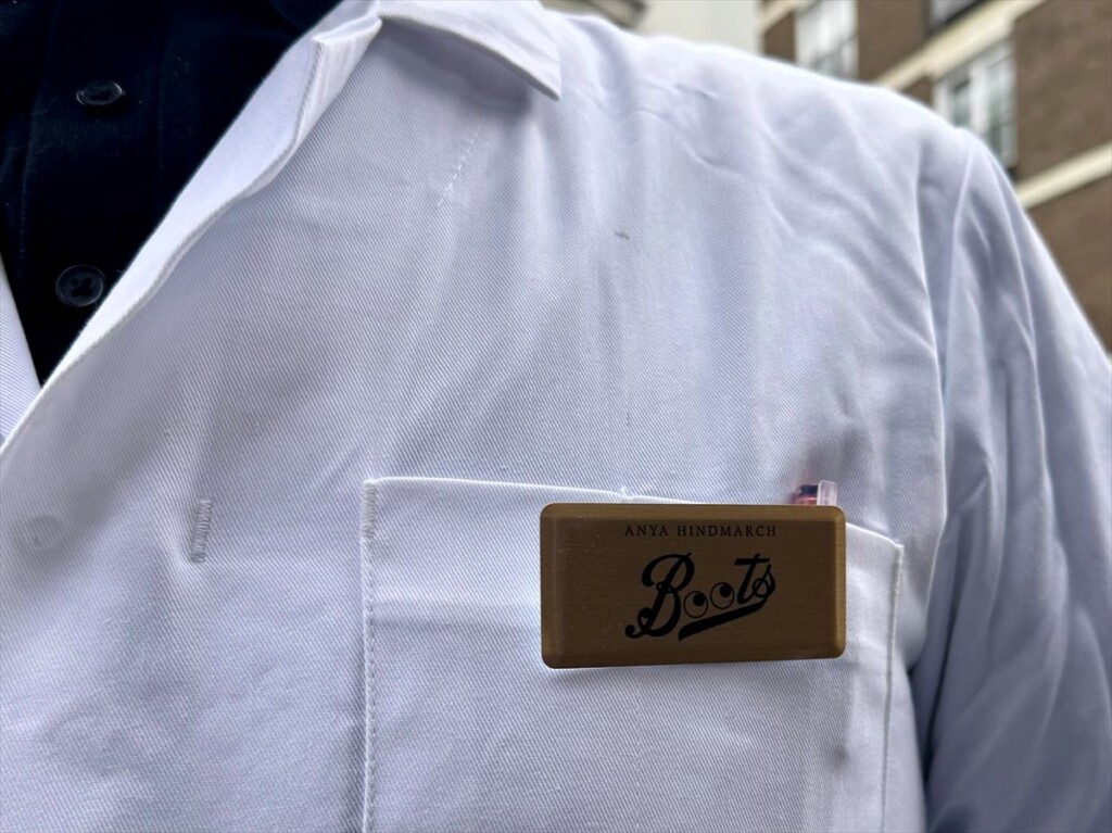 店員さんの制服もブーツの制服に寄せて、名札にもアイズが入ったブーツの文字入りで細部までこだわっています。