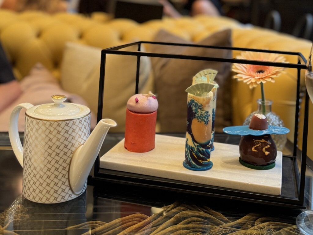 今回、ローズウッドホテルが打ち出したのは、日本を代表する浮世絵師・葛飾北斎に着想を得たアフタヌーンティーである。どのスイーツも、北斎の浮世絵のような躍動感と色彩の遊び心が感じられる。和の要素を表面的に取り入れるだけではなく、英国伝統のアフタヌーンティーの枠組みに見事に調和させていたことである。
