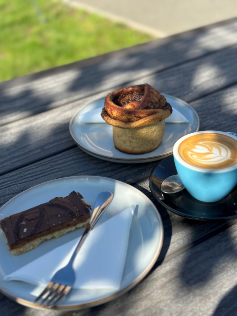 観光目的ではなかなかいけないエリア、その日は天気もよくて心地よい風を感じながら、外のテーブルでシナモンロールとミリオネアショートブレッドをいただきました。