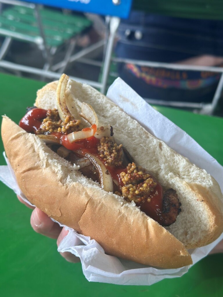 わたしたちは新鮮なフルーツを買ったり、ソーセージドックを食べたり。